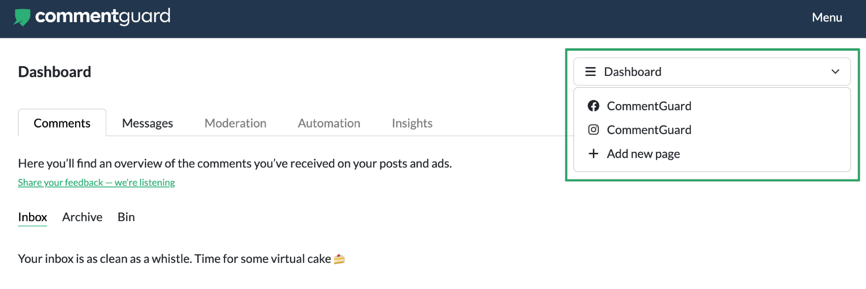 In your dashboard, click on the dropdown in the top-right to select one of your pages.