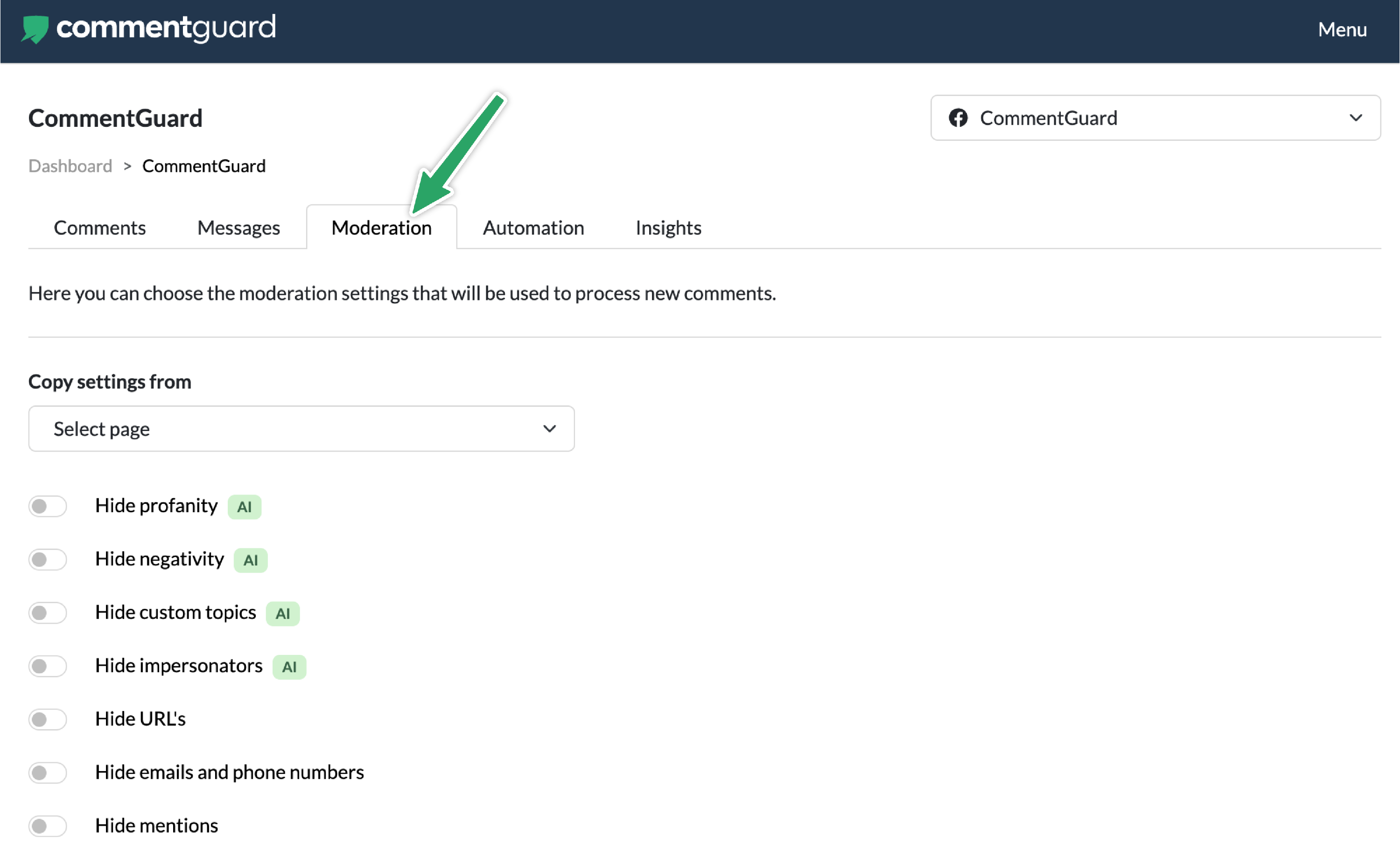 If you have already setup the moderation for one of your other pages, you can save time by copying the settings from another page. This can be very useful, for example when you want to apply the same moderation settings to the Facebook and Instagram of the same brand.